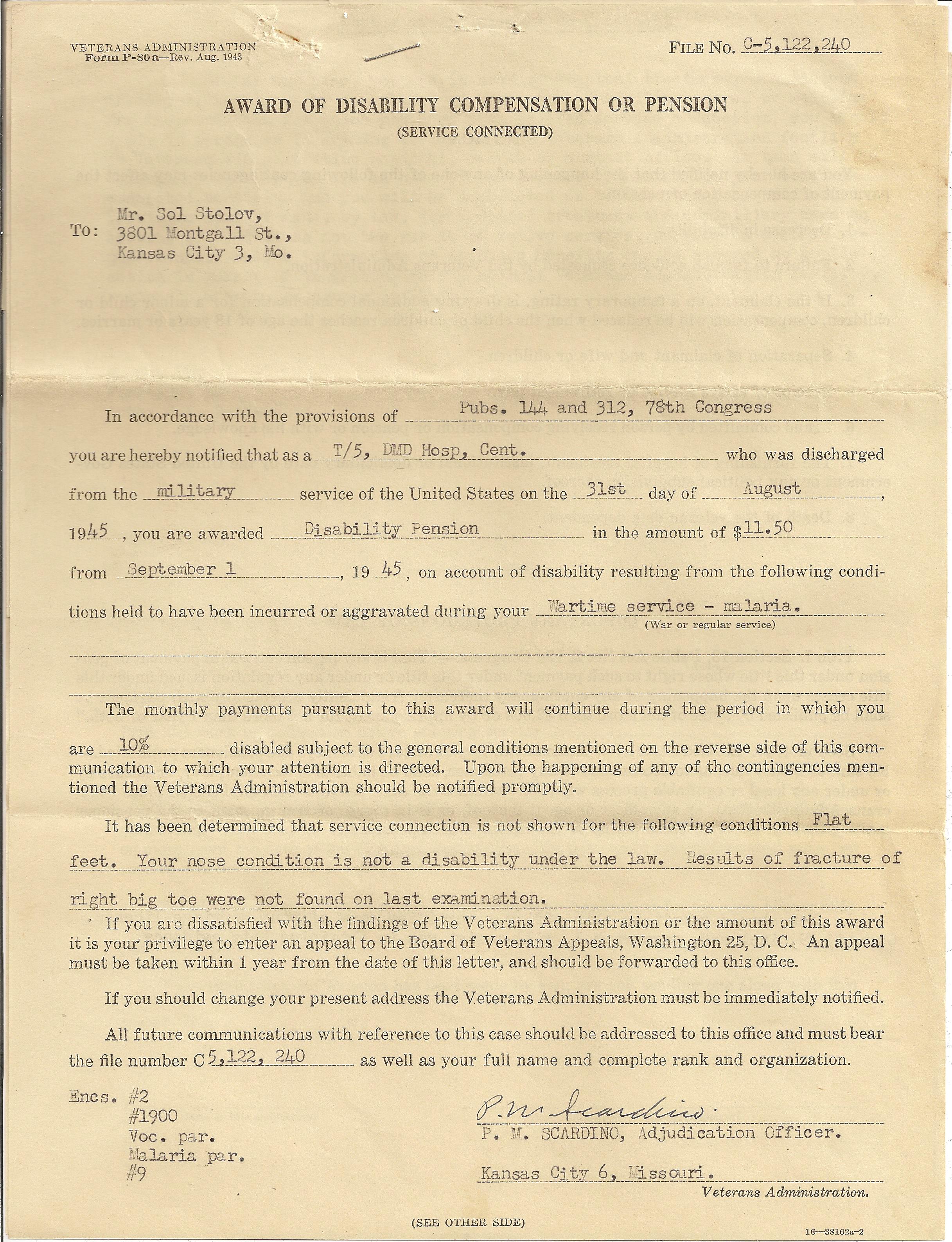 Sol Stolov, Military Disability Compensation, 1945