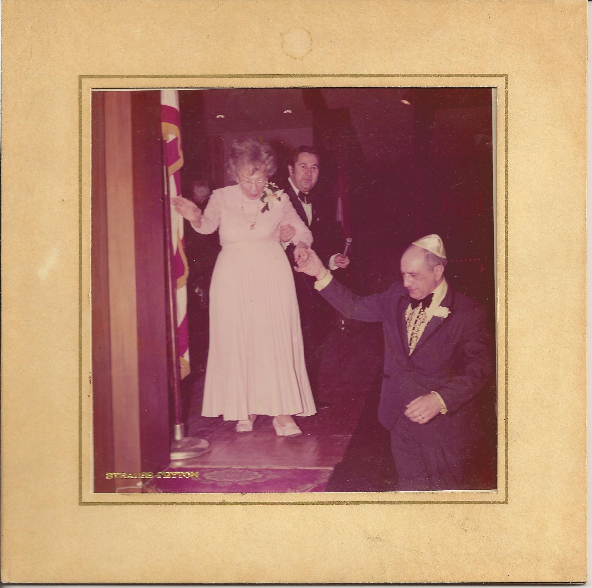 Rose Cohn being helped down by Arnold Levine