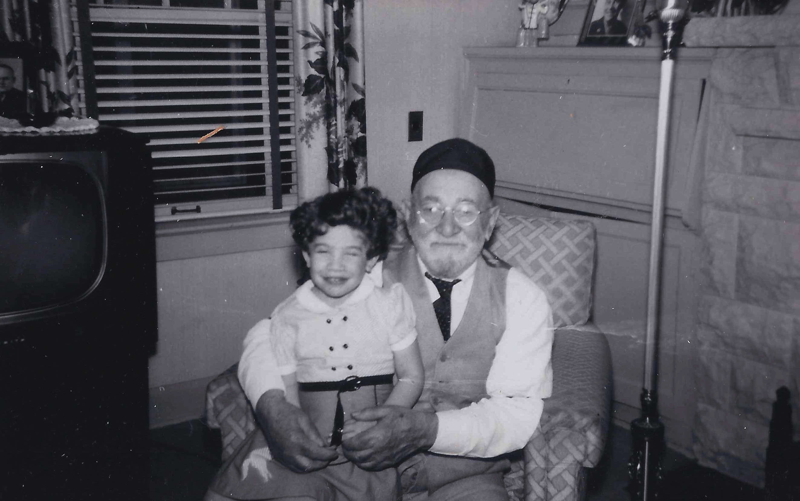 Comments on Yaakov Mechal Schulman holding Sherry Levine Krug, 1954