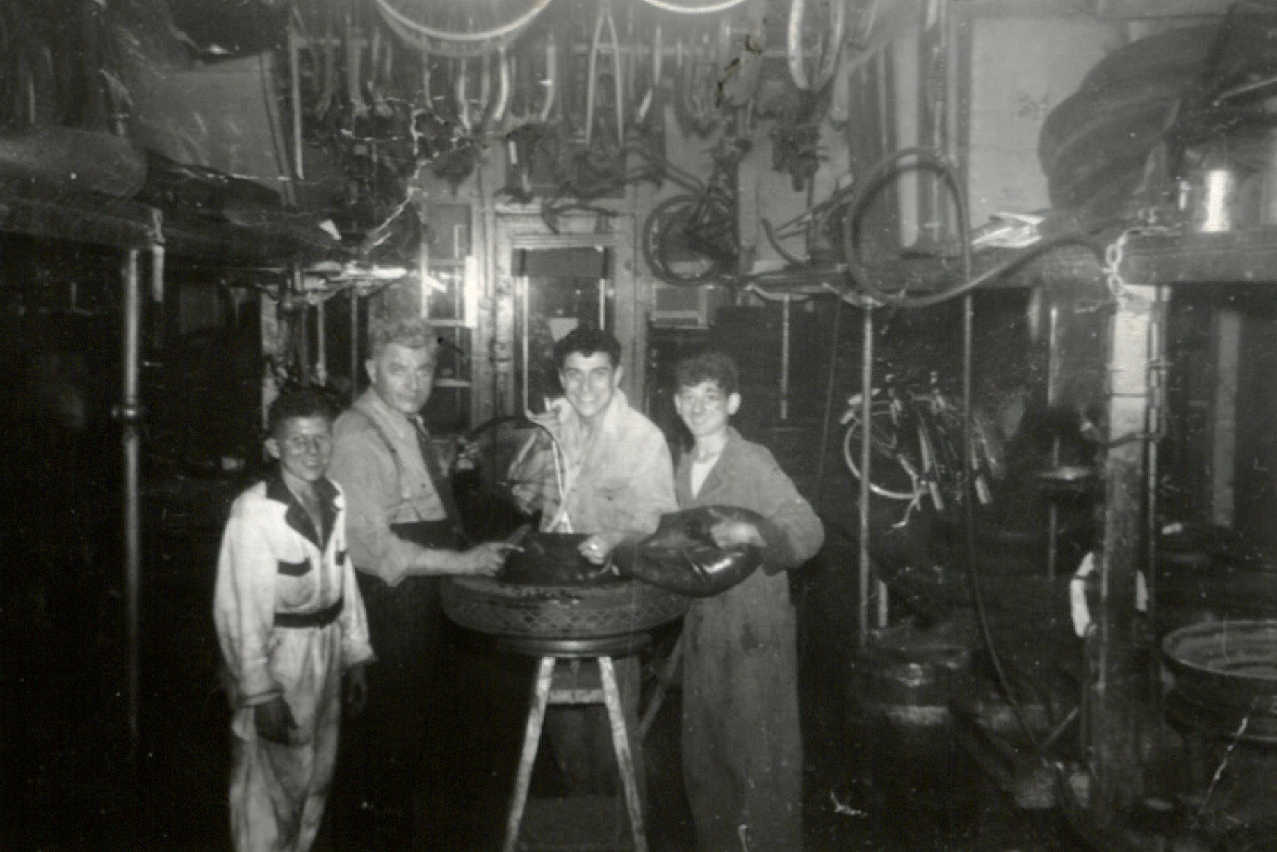 Joe and Cal Steinlauf in the middle at the bike or tire shop