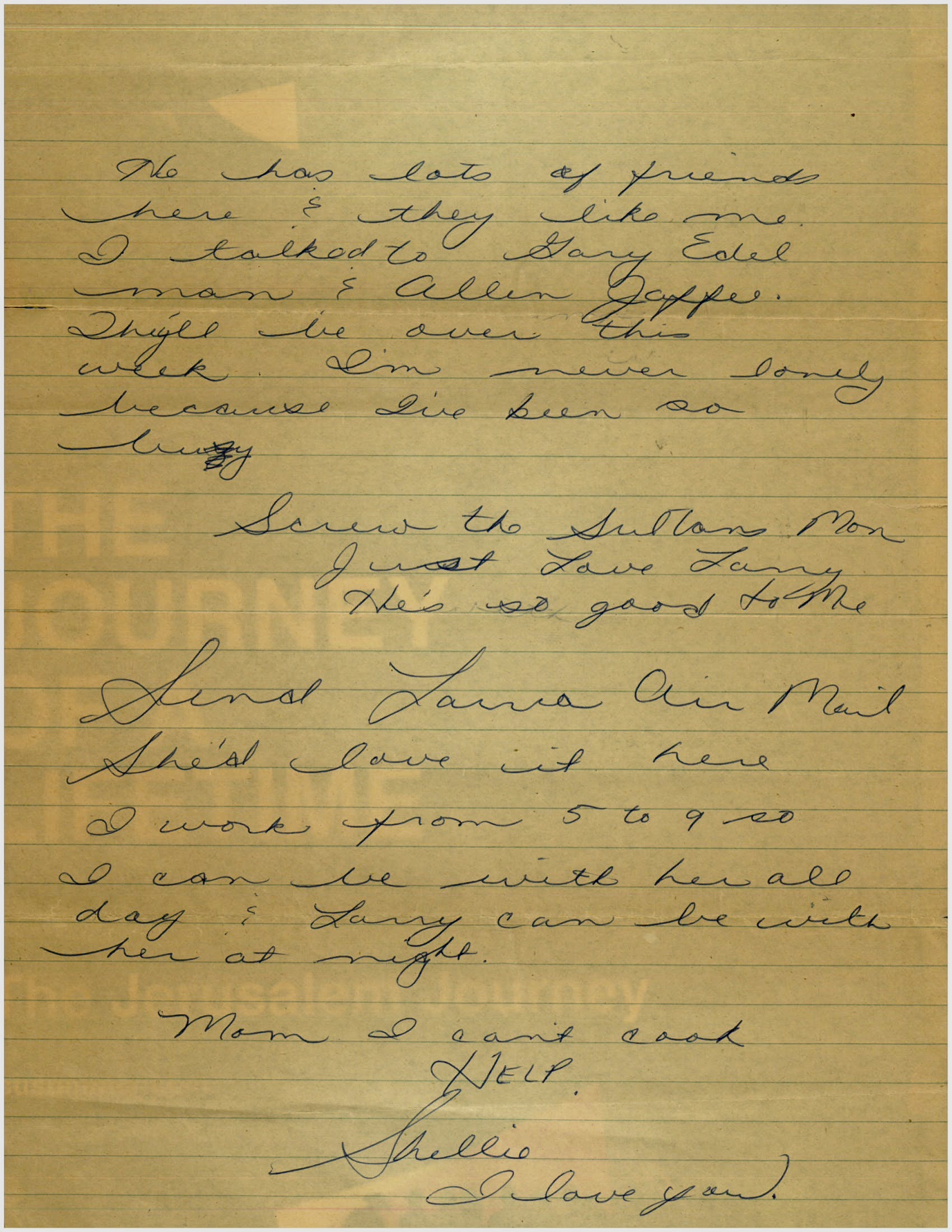 Letter from Shellie Steinlauf to her parents, Cal and Blanche, shortly after her marriage. She was away from home, 18 years old, and with her husband as he finished law school.