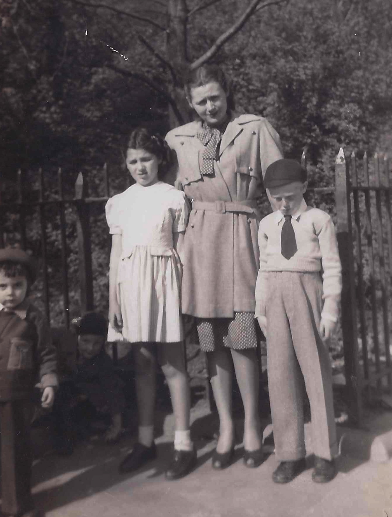 Rivka Edith Weiss, Violet Bleier Silvern, and Joe Weiss in Prospect Park, Brooklyn, NY. Abt 1945. See notes.