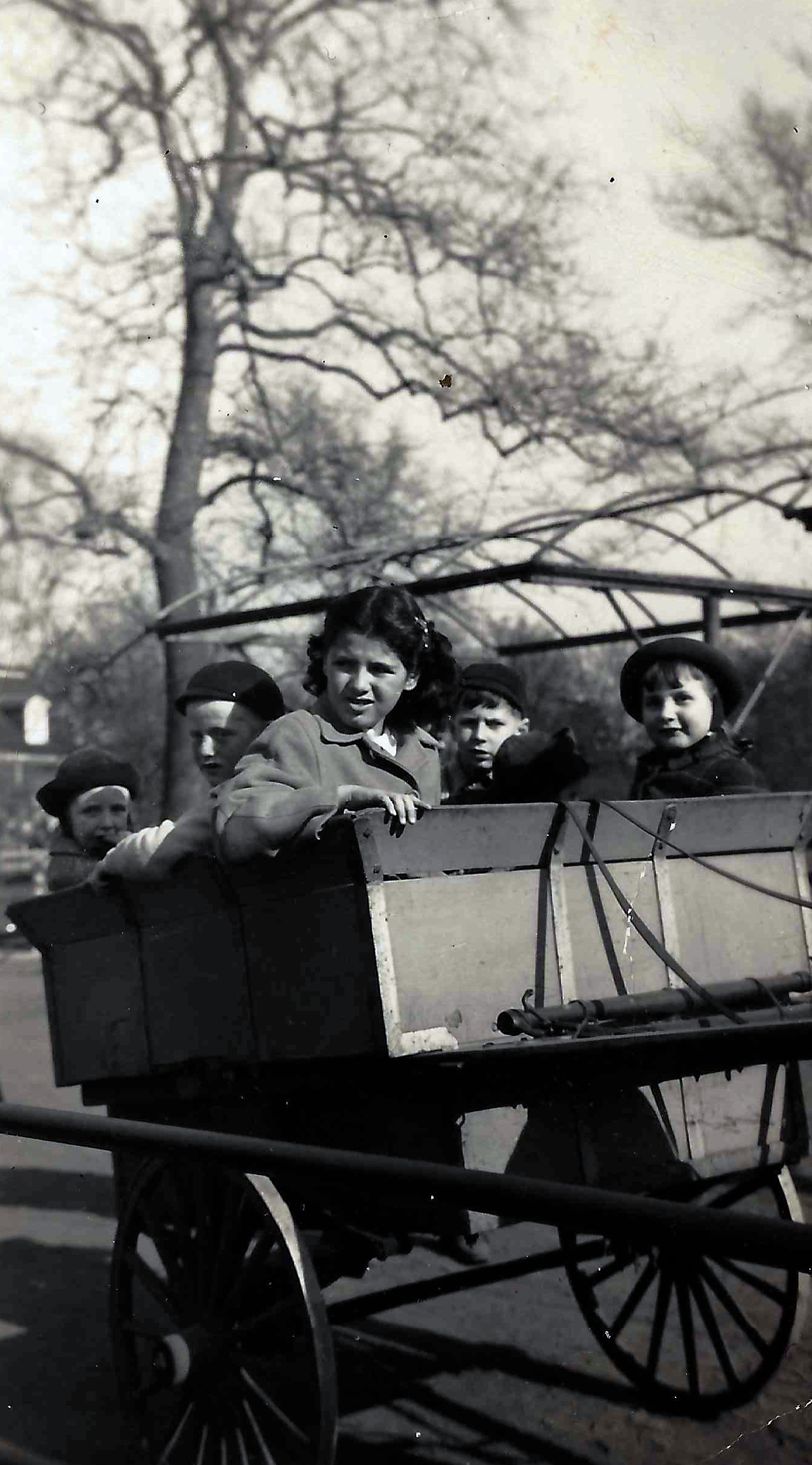 Joe Weiss and Rivka Edith Weiss w friend Arni Gurwitz on a wagon ride in Brooklyn, NY. 1945.