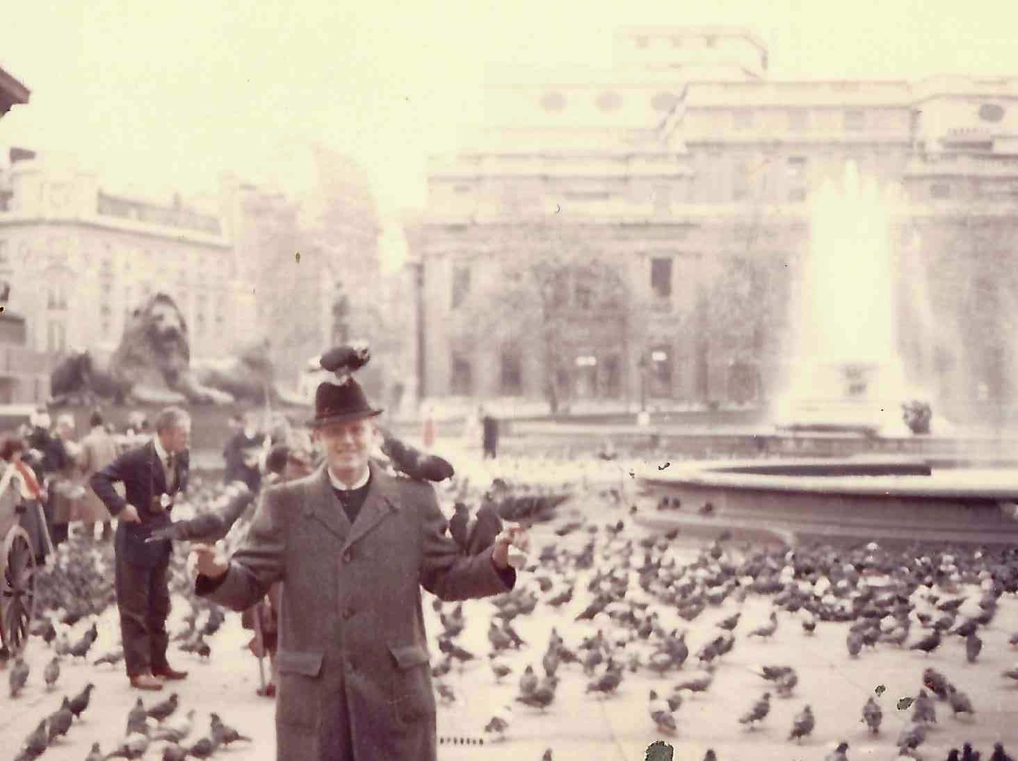 Outside the museum is a big part with aleast 1,000 birds (pigeons) so, just like in the Catskills Game Farm, I bought food and they went on my shoulders, hands, and head so Marty took a picture.