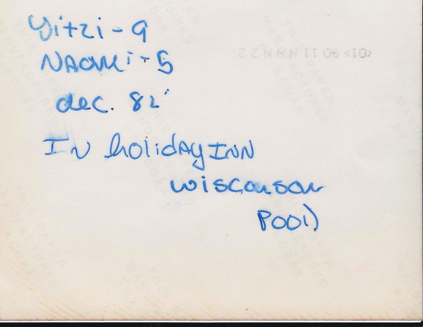 Comments on YItzi Weiss (9) and Naomi Weiss Cohn (5) swimming in Holiday Inn Pool, Wisconsin, 1982