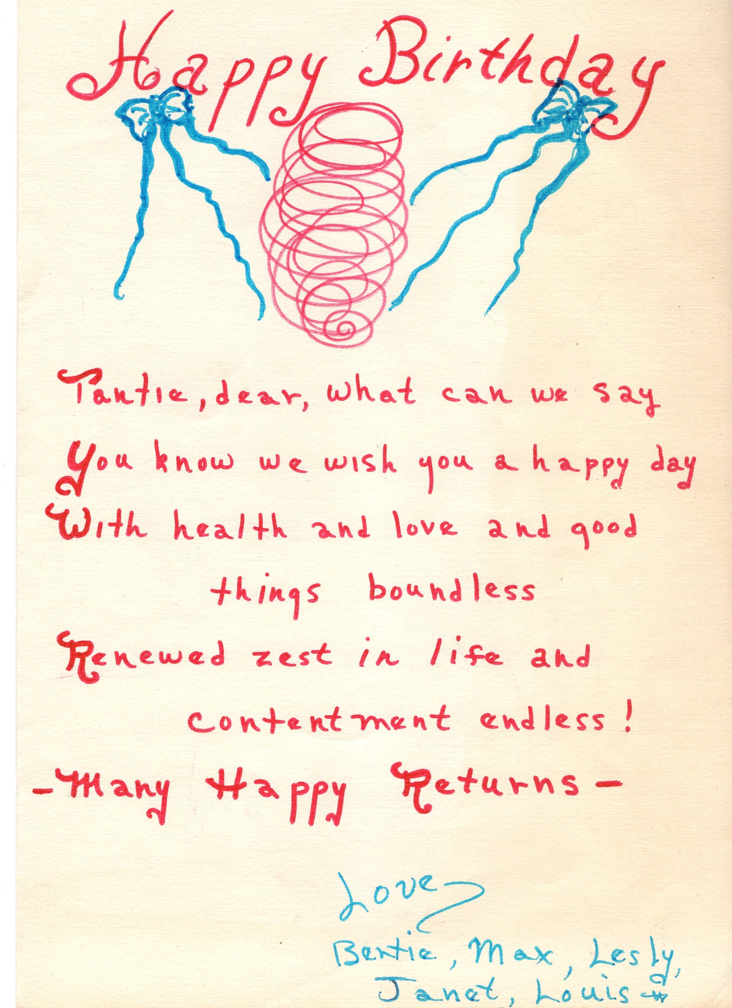 Comments on Birthday card for Esther Wolfson. Sept 20, 1970