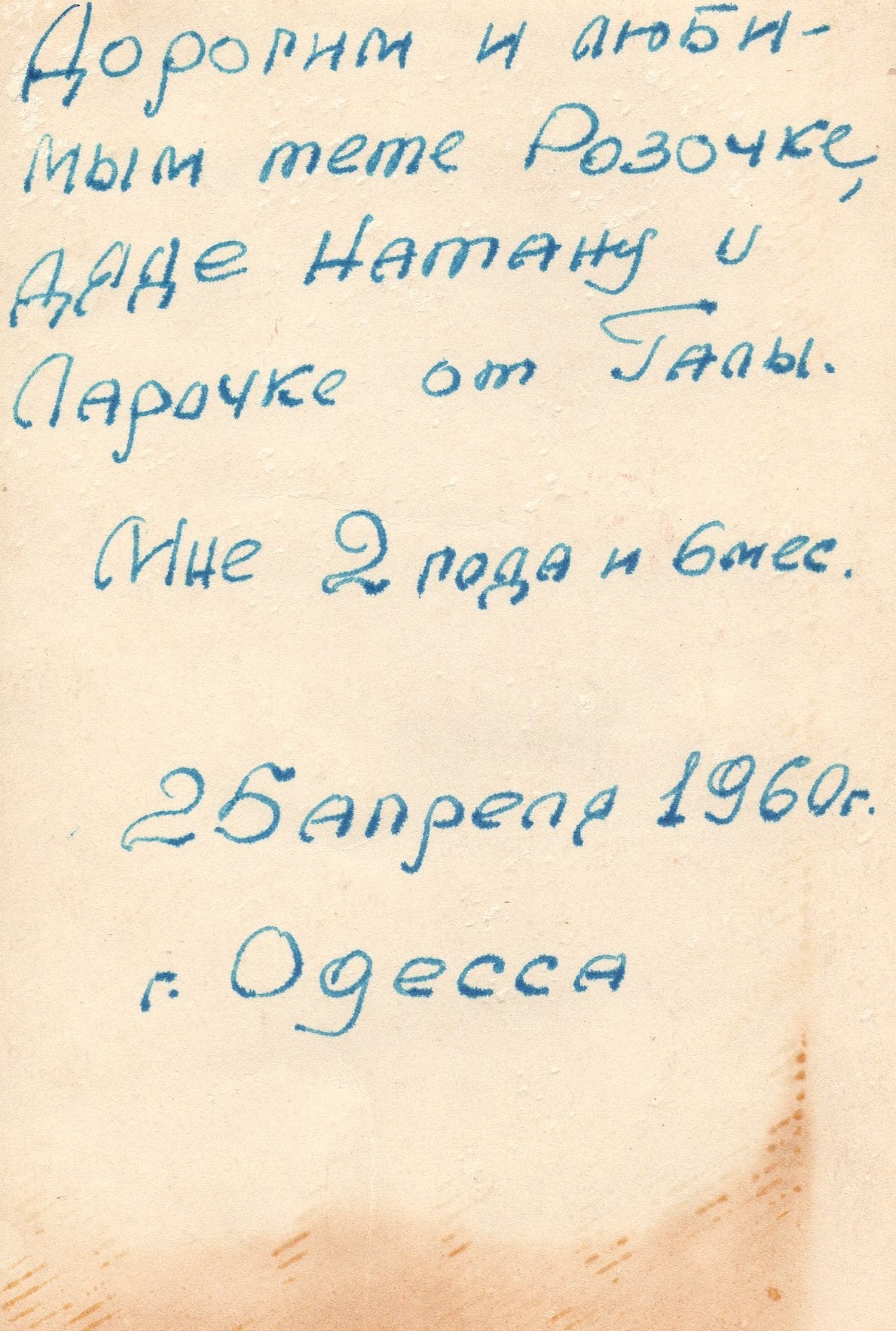 "To dear beloved aunt Rozochka (Roza Shatajko Komar), uncle Nathan (Natan Komar) and Larochka (Laura Komar Breitburg) from Gala. I am 2 years and 6 months old.