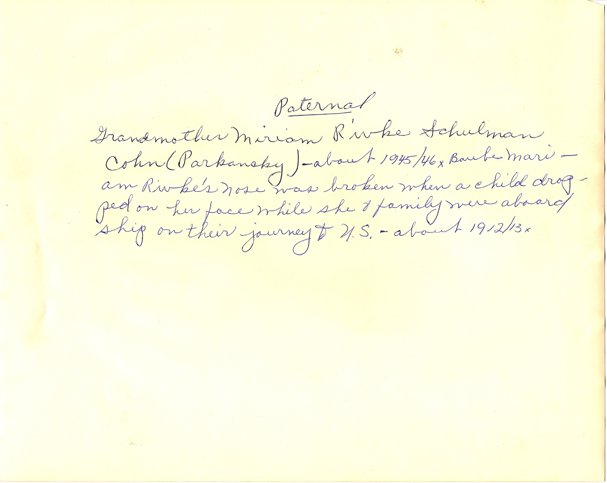 Baube Mariam Rivke's nose was broken when a child dragged on her face while she and family were abourd ship on their journey to US about 1912/13.