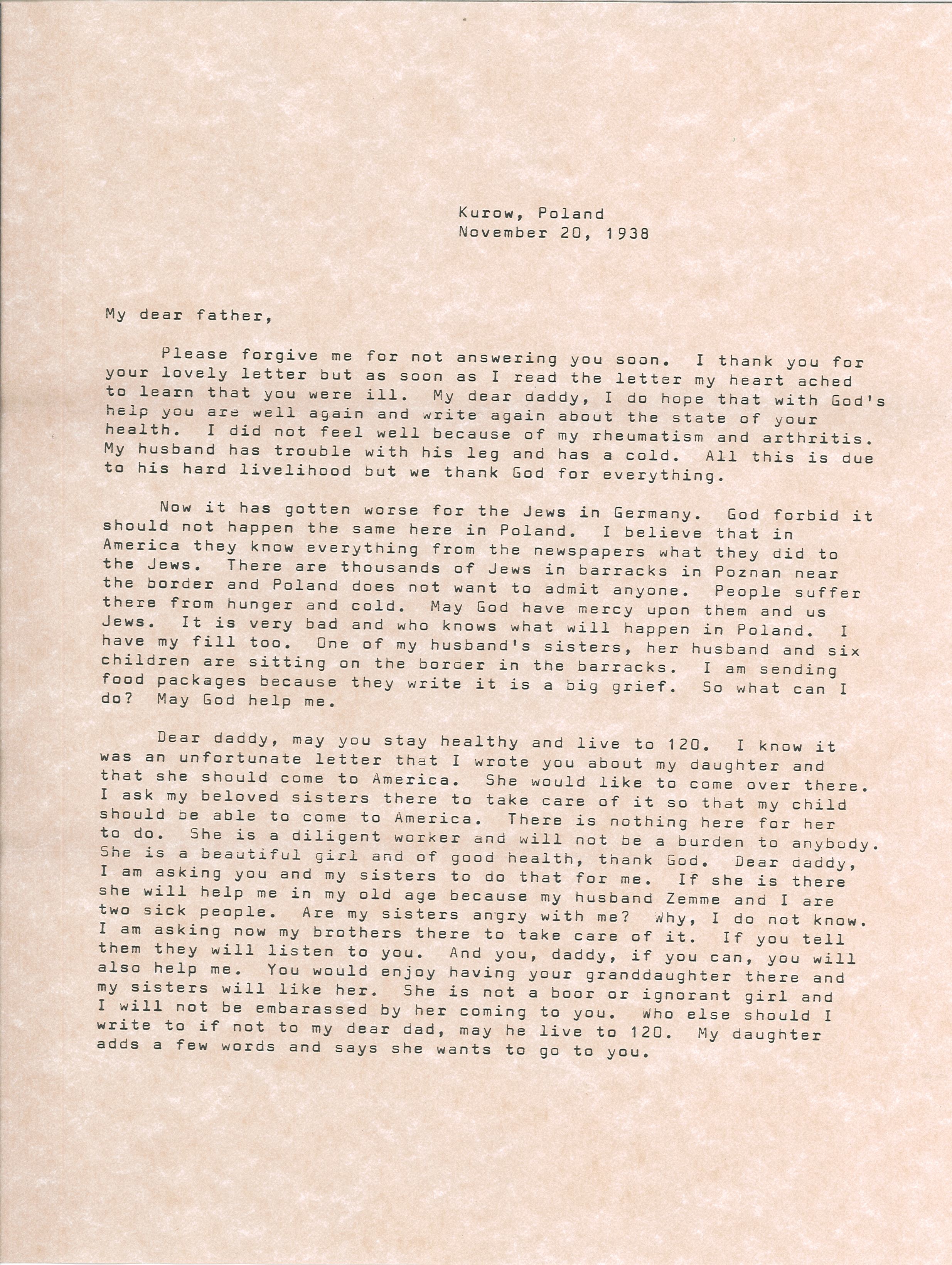Now it has gotten worse for the Jews in Germany. God forbid it should not happen the same here in Poland. I believe that in America they know everything from the newspapers about what they did to the Jews. There are thousands of Jews in barracks in Poznan near the border and Poland does not want to admit anyone. People suffer there from hunger and cold. May God have mercy upon them and us Jews. It is very bad and who knows what will happen in Poland. I have my fill too. One of my husband’s sisters, her husband and six children are sitting on the border in the barracks. I am sending food packages because they write it is a big grief. So, what can I do? May God help me.