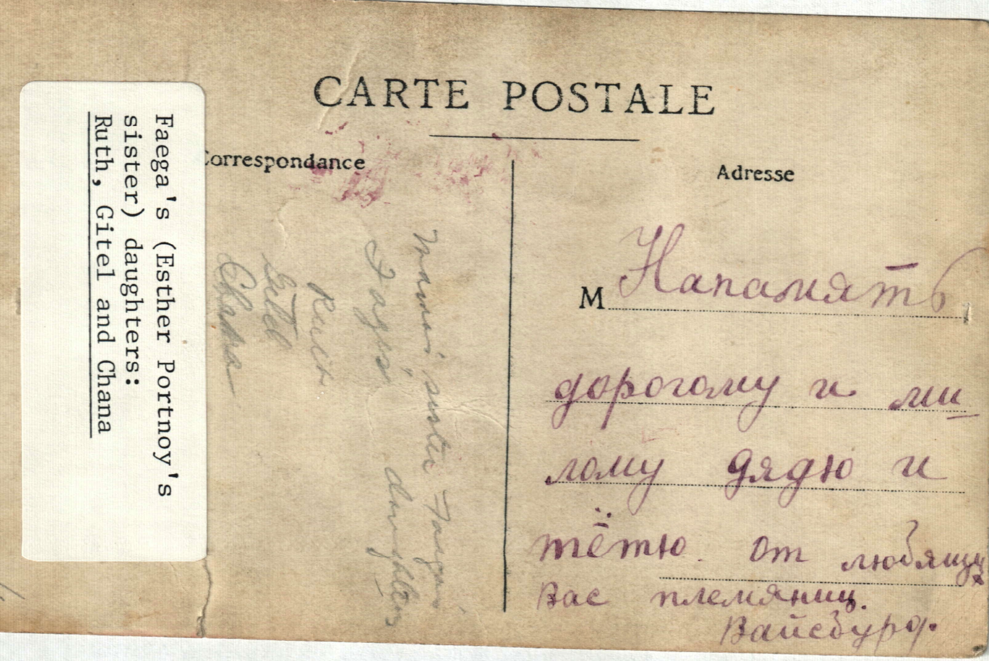 Probably sent from Faega Balaban Weissbord to her mother's brother and sister in law, Labe and Blooma Balaban but somehow was given to Esther Balaban Portnoy (Faega's sister) and then handed down to her daughter Goldie Portnoy Leon.