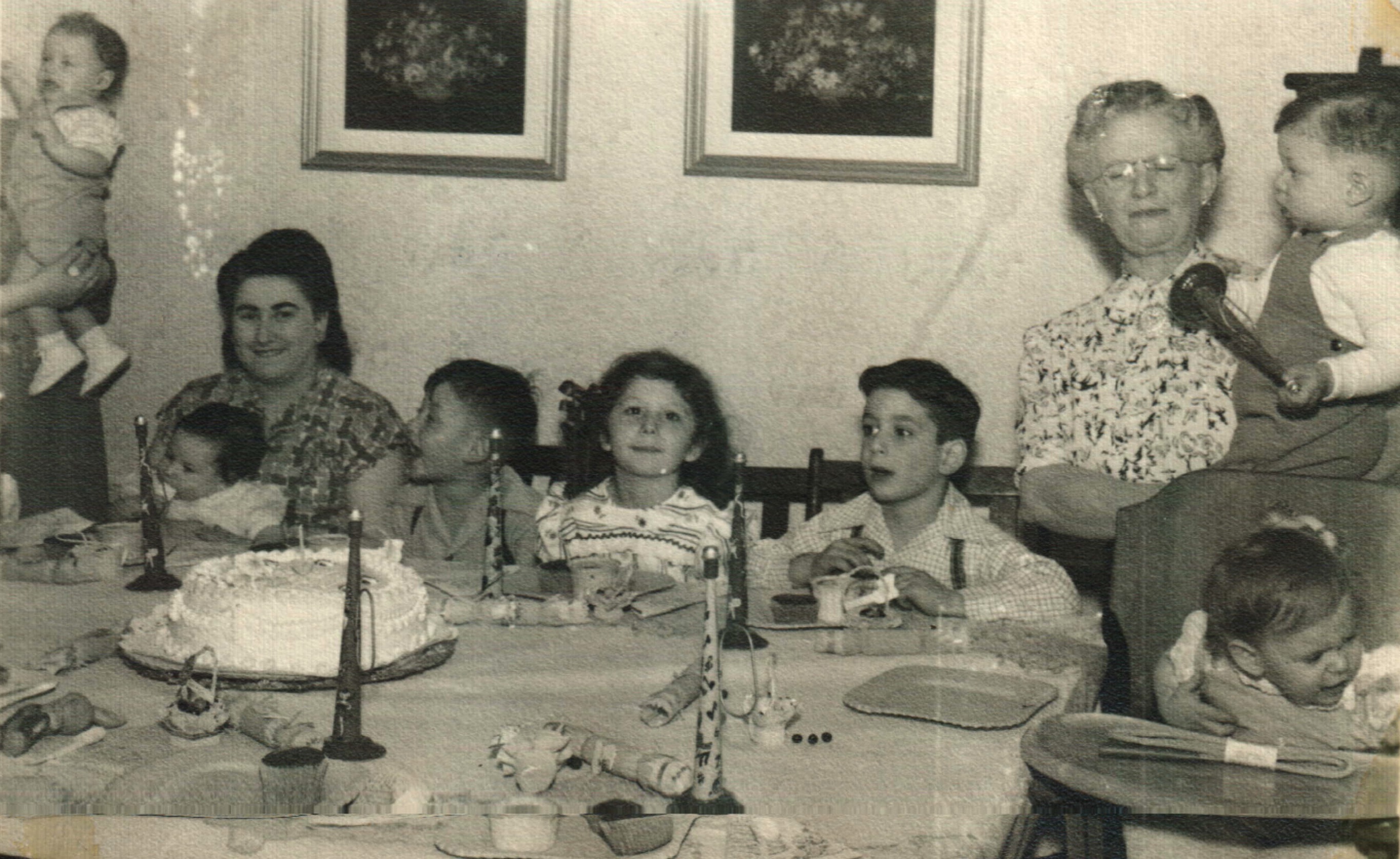 Larry at the table on the right side, Bala Baellow holding Marshall or Steve, Bobby Sue in the high chair