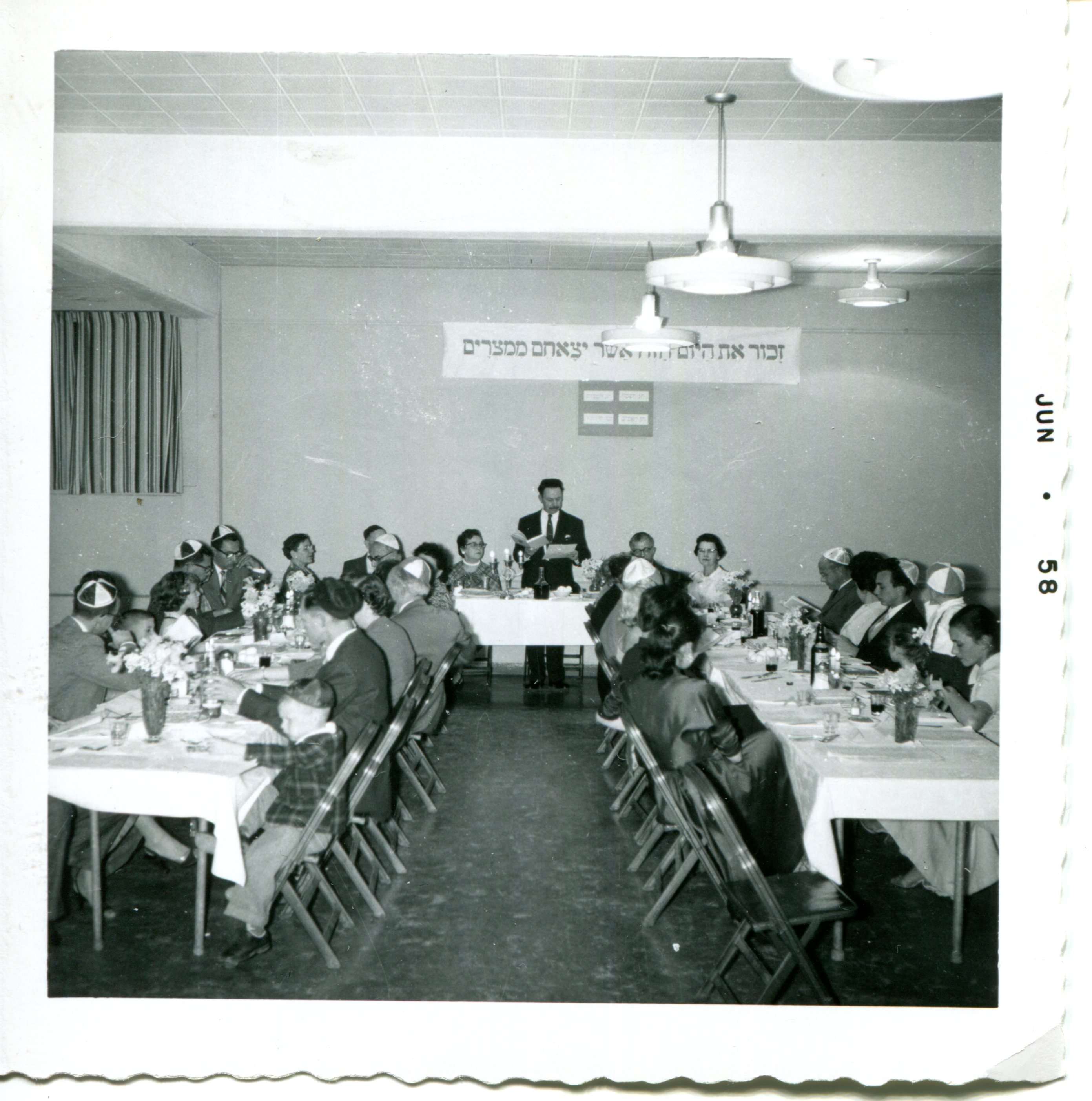 Oscar Dubin leading giant family seder, 1958. See notes.
